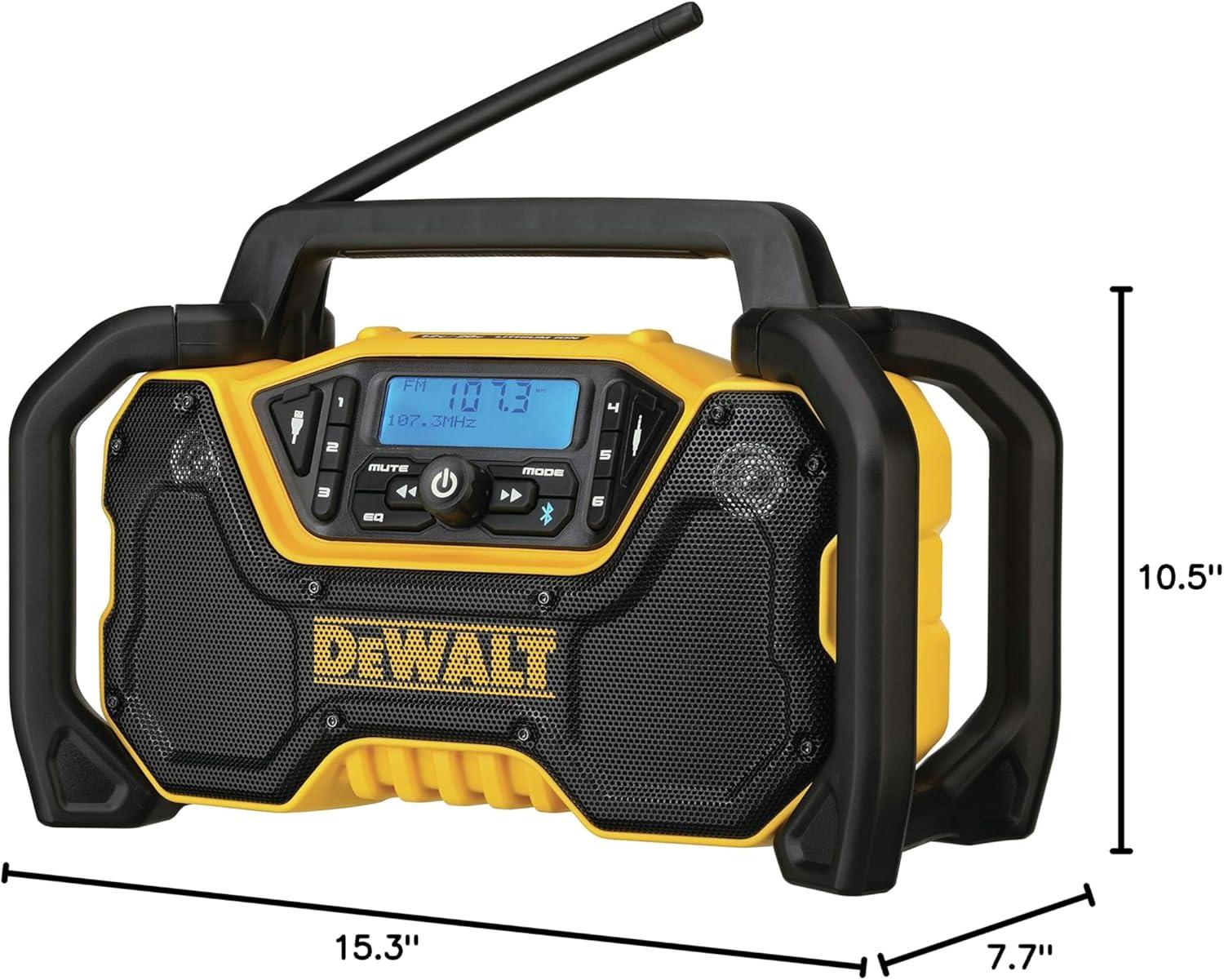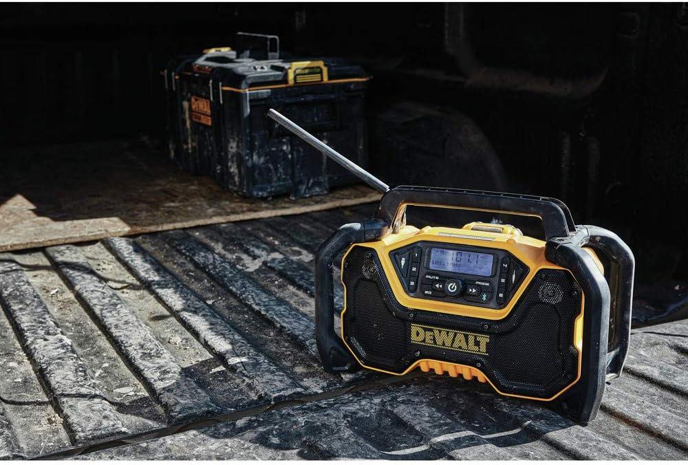 The 12V/20V MAX* Bluetooth Jobsite Radio provides premium sound in the toughest work environments. DEWALT radio has durable roll-cage design to withstand drops and impacts. The innovative handle stores and protects the radio antenna when not in use. Quad speakers kick out true stereo sound with deep bass. Stream music via Bluetooth from up to 100 feet, or connect through the built-in auxiliary port. AM/FM radio includes six customizable presets per band. A convenient USB port charges your mobile devices. This cordless jobsite radio includes a detachable AC power cord, or power with DEWALT 12V MAX*, 20V MAX*, or FLEXVOLT batteries (sold separately). The Bluetooth Radio Speaker includes a 3-year limited warranty.