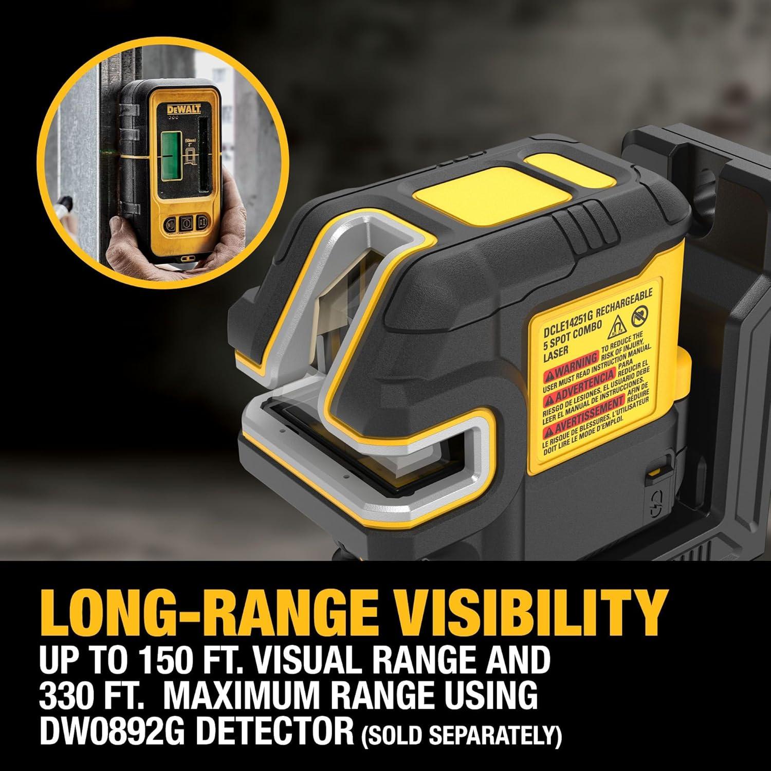 DEWALT 150 ft Green Cross Line 5 Spot USB Rechargeable Laser Level Kit with Remote Control, Self Leveling, Adjustable Brightness, Adapter USB Cable and Bracket Included,Tripod Compatible (DCLE14251G)(5 Spot Cross Line Laser Kit)
