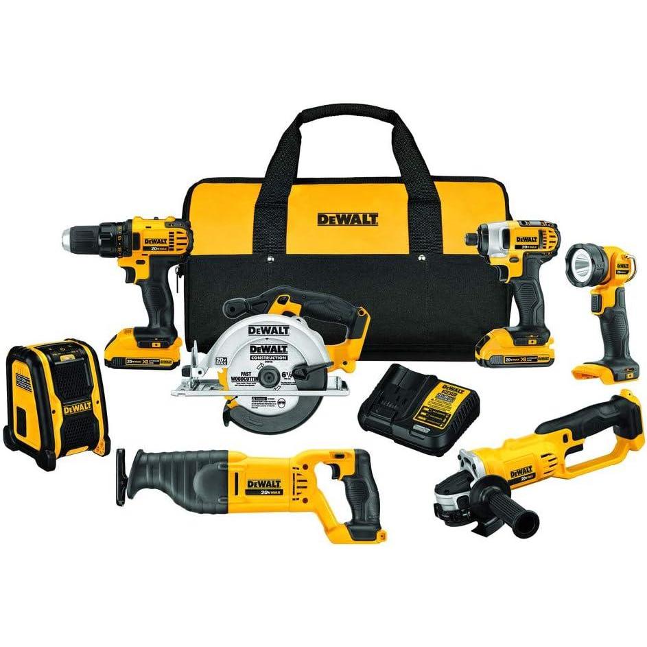 The DEWALT 20V MAX* Compact 7-Tool Combo Kit comes with a 2.0Ah battery. DEWALT 20V MAX cordless tools combo kit includes our DCD780 20V MAX* Compact Drill/Driver which is lightweight and compact for working in tight spaces for long periods. The DCF885 20V MAX* 1/4-inch Impact Driver as a part of DEWALT cordless tools is compact and lightweight for fitting in tight spaces and increasing productivity. The DCS393 20V MAX* Circular Saw with 6-1/2-inch carbide blade can cut 2x4s at a 45 degree angle in a single pass. The DCG412 20V MAX* 4-1/2-inch / 5-inch Grinder increases productivity with features like the Quick-Change wheel release, convenient trigger switch with lock-off button, and extended runtime battery. The DCS381 20V MAX* Reciprocating Saw with a keyless blade clamp allows for quick blade change without touching the blade or reciprocating shaft. The DCR006 Jobsite Bluetooth Speaker is powered by AC/DC and runs off of 12V and 20V MAX* DEWALT battery packs. The DCL040 is a bright flashlight to illuminate your work area with LED output of 110 lumens.