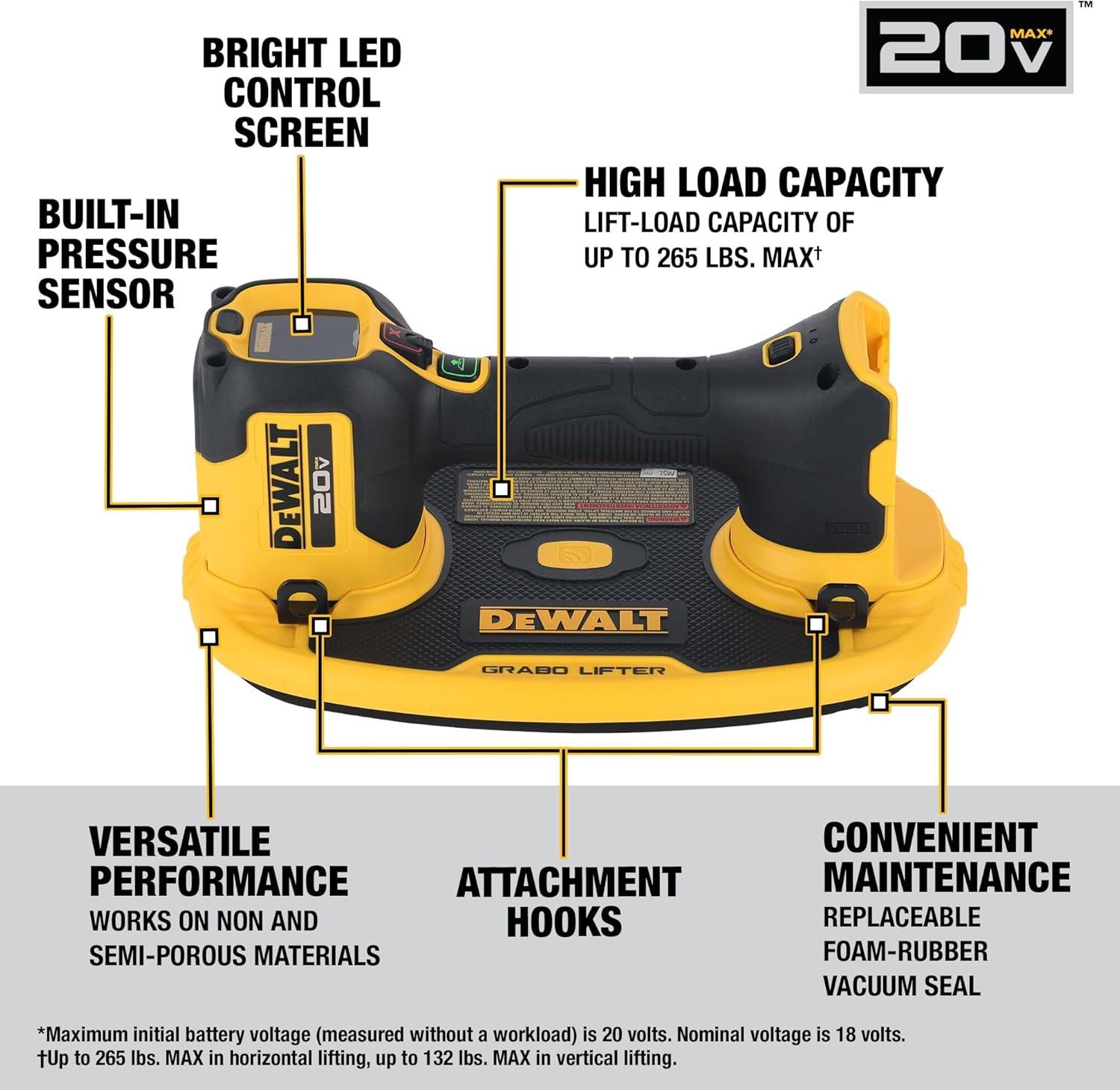Grab and lift construction materials with the DEWALT 20V MAX* GRABO LIFTER. With a lift-load capacity of up to 265 lbs. MAX, this Lifter utilizes a powerful electric vacuum pump to lift a wide range of heavy construction materials including glass, tile, and metal, as well as semi-porous materials like wood, drywall, concrete and natural stones. This product is equipped with a built-in pressure sensor that automatically controls the pump that helps to maintain the vacuum grip. Featuring a digital pressure gauge display, audio alarm, and a double-action button, the DEWALT 20V MAX* GRABO LIFTER helps maximize user control during lifting, carrying or installation applications. Powered by a 20V MAX* battery, this tool conveniently offers generous runtime for long work days.