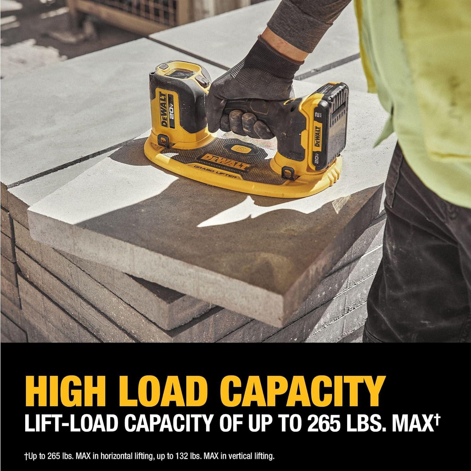 Grab and lift construction materials with the DEWALT 20V MAX* GRABO LIFTER. With a lift-load capacity of up to 265 lbs. MAX, this Lifter utilizes a powerful electric vacuum pump to lift a wide range of heavy construction materials including glass, tile, and metal, as well as semi-porous materials like wood, drywall, concrete and natural stones. This product is equipped with a built-in pressure sensor that automatically controls the pump that helps to maintain the vacuum grip. Featuring a digital pressure gauge display, audio alarm, and a double-action button, the DEWALT 20V MAX* GRABO LIFTER helps maximize user control during lifting, carrying or installation applications. Powered by a 20V MAX* battery, this tool conveniently offers generous runtime for long work days.