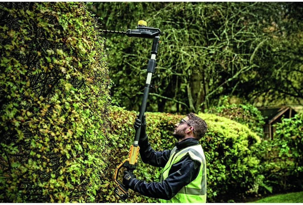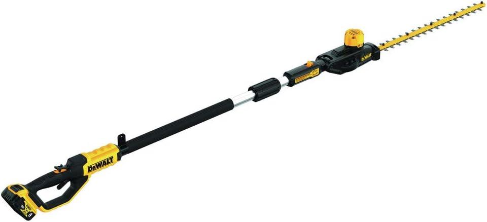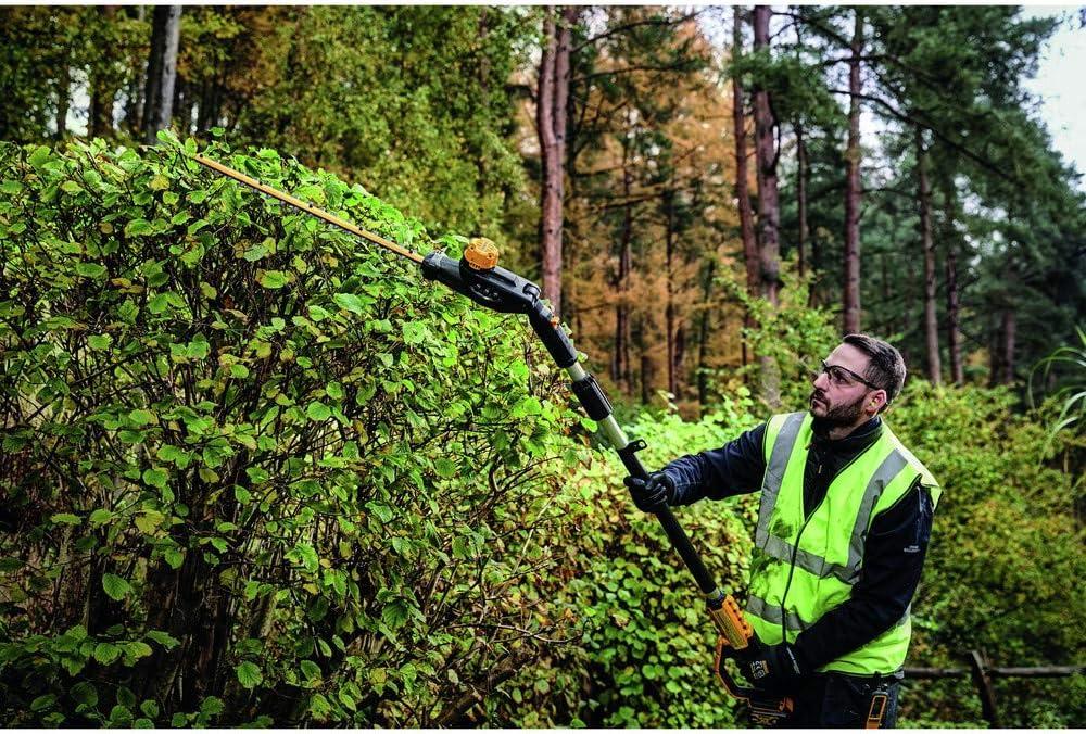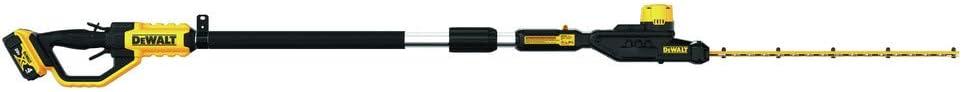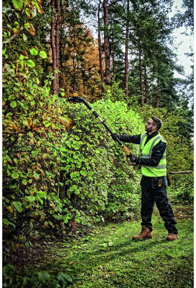 This Pole Hedge Trimmer is designed to cut through a variety of landscape overgrowth. The pole hedge trimmer has a high output motor and 22 in. hardened steel laser-cut blades engineered for clean, fast cuts on branches up to 1 in. thick. The 7-position, and articulating head allows you to customize cutting angles for hedges of any shape and size. When fully extended, the pole hedge trimmer can be extended up to a 12 ft. max reach. Includes DCB204 Battery, Charger, Trimmer Head, Shoulder Strap, Blade Sheath, DCPH820 Pole Hedge Trimmer