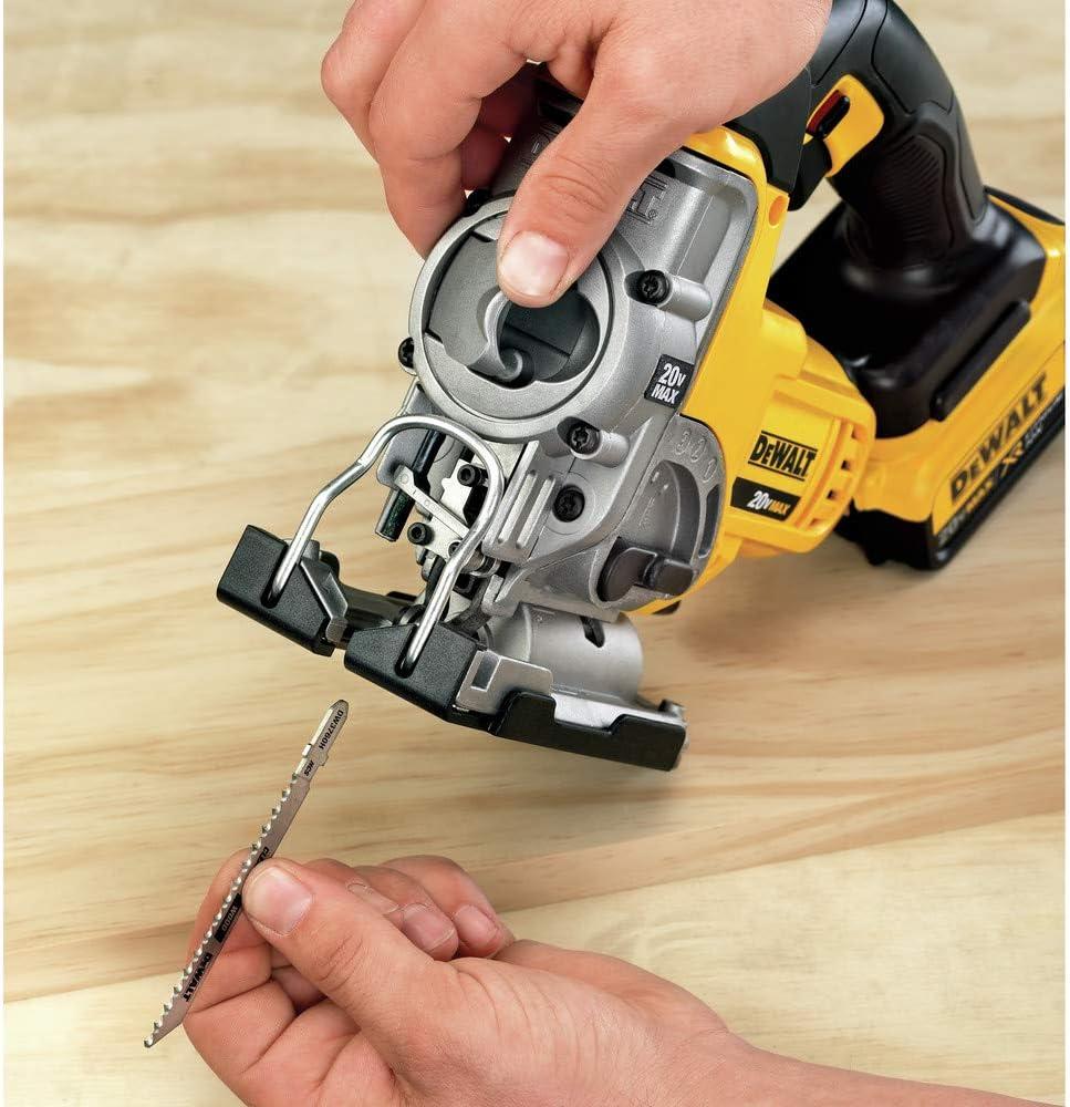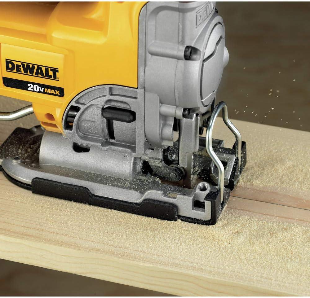 The DCS331M1 20V MAX* Cordless Jig Saw Kit has an all metal, lever-action keyless blade clamp designed for quick and easy blade changes and an all-metal keyless shoe bevel with four detents to make bevel adjustments easy. The variable speed trigger provides up to 3,000 strokes per minute to easily adjust speeds during cutting and 4-position orbital action for wood cutting. A removable shoe cover helps protect materials from scratches and the dust blower helps users see where they're cutting.