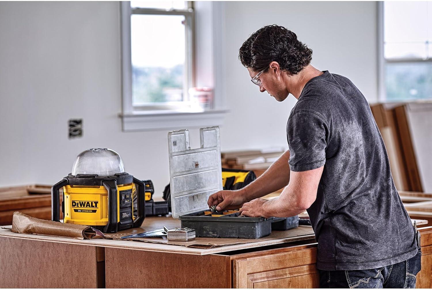 Our Tool Connect All-Purpose Cordless Work Light lights up the jobsite. This LED work light is compact and portable so it's convenient for everyday tasks, and it's bright enough to light large areas. Powerful, efficient LED technology produces up to 5000 lumens of natural white light, without the heat and hassle of halogen. The All-Purpose Light can be used freestanding or hung with a convenient integrated hook. The light works with all DEWALT 20V MAX* and FLEXVOLT batteries, with up to 11 hours of runtime for a full day of work*. Also, use the free Tool Connect app to control and monitor your LED rechargeable work lights remotely on the jobsite. Plus, its impact resistant body and lens, and a 3-year limited warranty, it will stand up to your tough jobsite environments.