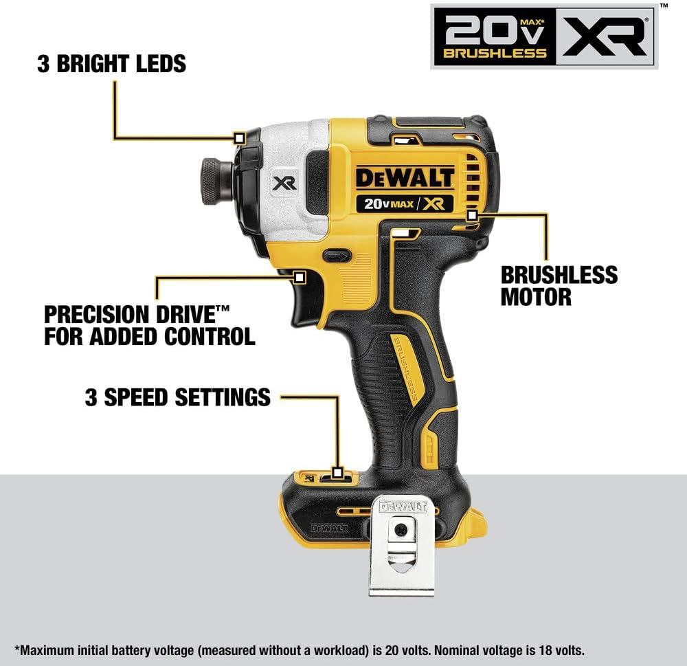 This 20V MAX XR Brushless Cordless 4-Tool Kit includes one hammer drill/driver, impact driver, reciprocating saw, LED work light, two 5.0Ah batteries, charger, and kit bag. Both tools are equipped with a high-output brushless motors to help you tackle demanding projects. The DCD805 hammer drill/driver is equipped with a 3-position, pivoting LED for enhanced visibility in dimly lit work areas. The DCS382 reciprocating saw allows you to make quick cuts with its 1-1/8 in. stroke length and it's lightweight build. The DCF887 impact driver delivers up to 1,825 in-lbs of torque at only 5.3 in. front to back. Illuminate your workspace from above with the DCL040 LED work lights hang hook and hands-free operation.