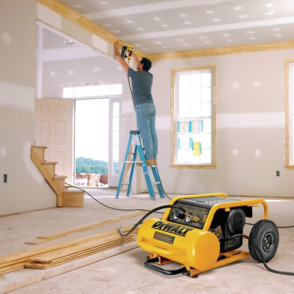 DEWALT built the D55146 Heavy Duty 4.5 Gallon, 200 PSI, Heavy Duty Hand Carry Compressor with Wheels is quiet, efficient and solidly built; constructed to withstand harsh jobsite conditions. Its dual connections allow users to simultaneously operate up to 3 framing nailers or 2 roofing nailers. This versatile compressor is useful to both small framing carpenters & remodelers and large trim carpenter crews & remodelers alike. The unique, patented high efficiency motor and high pressure pump provide a maximum pressure of 200 PSI with 5.2 SCFM @ 90 PSI so you never lose pressure. The D55146 is convenient, with an oil free, maintenance free pump and is easy to move & store with pneumatic wheels. It’s the perfect compressor to choose if you need a lot of power and a low maintenance tool.