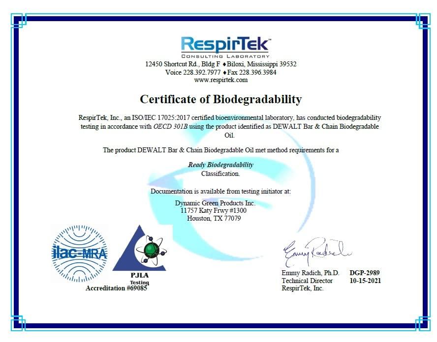 Proven Performance & American-Made Quality: Tested by treecare and industry experts, this ultraclean DEWALT lubricant delivers exceptional thermal control and durability. Made in the USA, it features up to a 300% higher viscosity index than conventional petroleum chain oils, ensuring superior lubrication and reliable performance in all conditions.