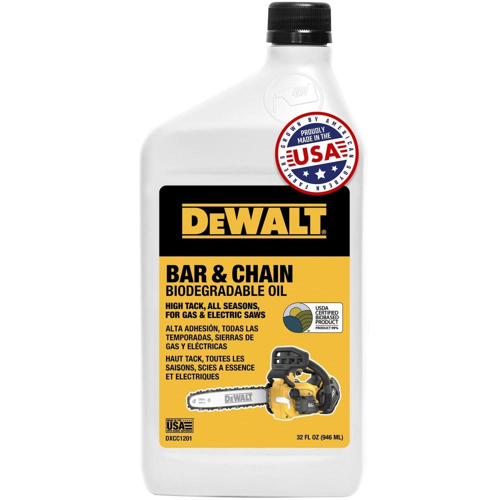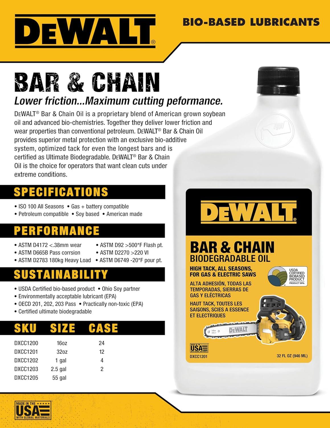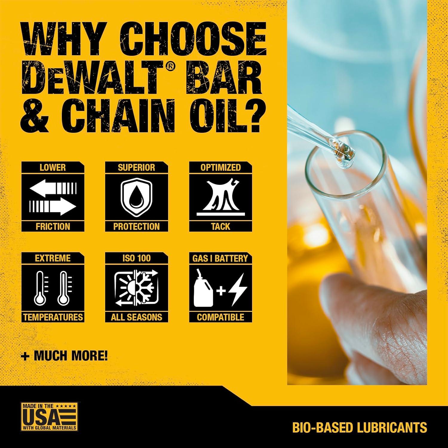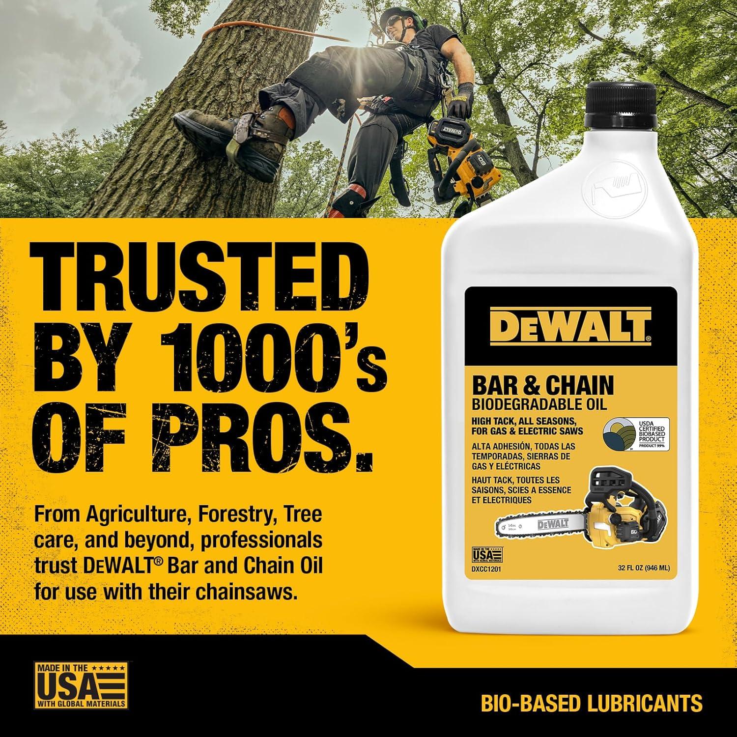 DEWALT – Biodegradable Bar & Chain Oil – Green, Eco-Friendly, Non-Toxic Professional Bar & Chainsaw Lubricant – Ultraclean All-Season Oil for Gas, Electric Saw, and Pole Saw, 16 oz(32 oz)