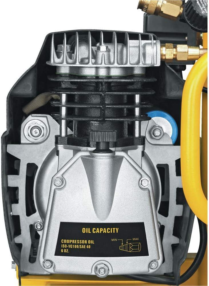 The DEWALT D55151 Hot Dog Compressor has all the power of a large compressor, but constructed as a smaller, lighter unit. It delivers 3.2 cubic feet per minute at 100 psi and is durably built with oil-lubricated cast-iron cylinder. Included with the Hot Dog Compressor are a 2/8 inch regulator and an initial fill of DEWALT synthetic air compressor oil.