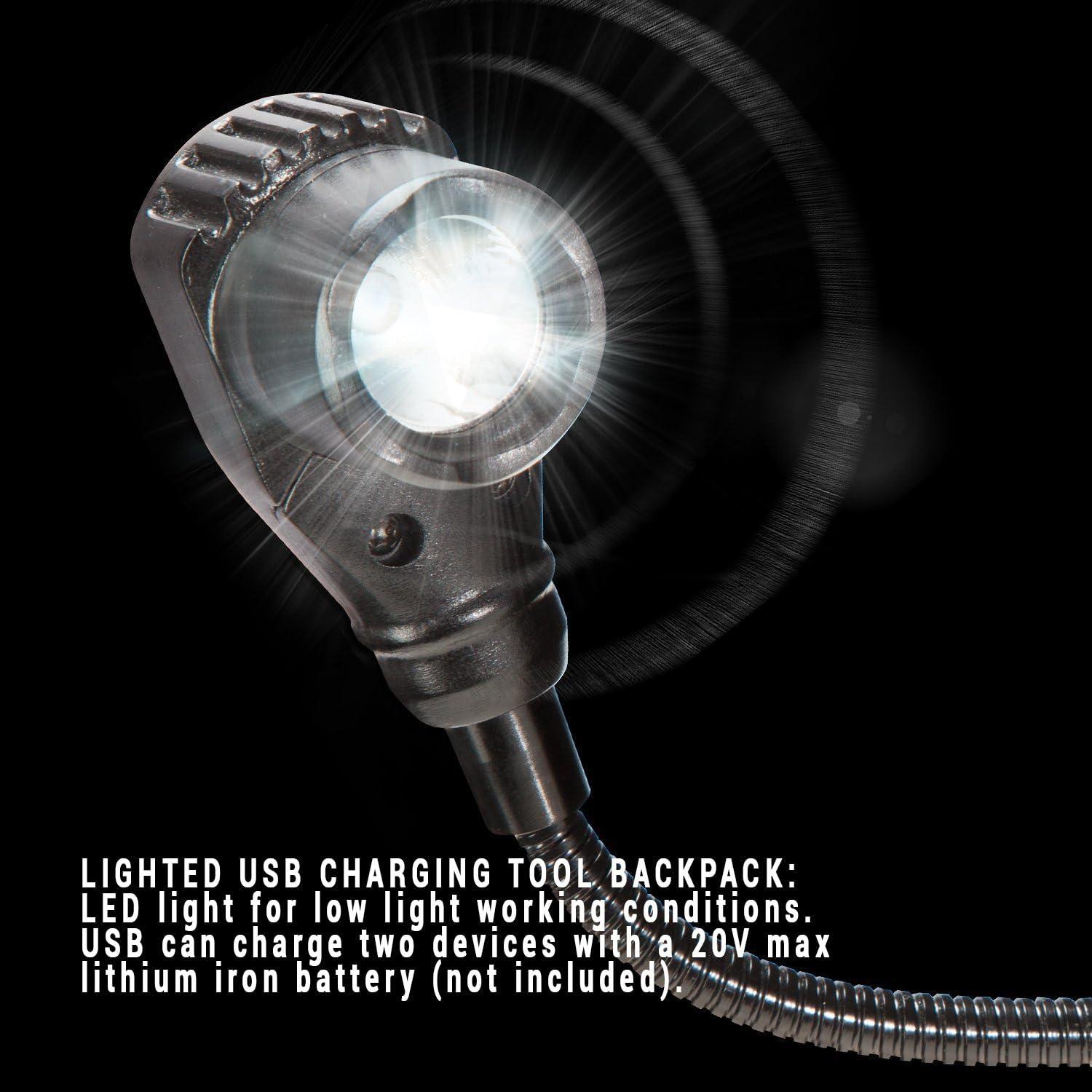 LIGHTED USB CHARGING TOOL BACKPACK: LED light for low light working conditions. USB can charge two devices with a 20V max lithium iron battery (not included).
