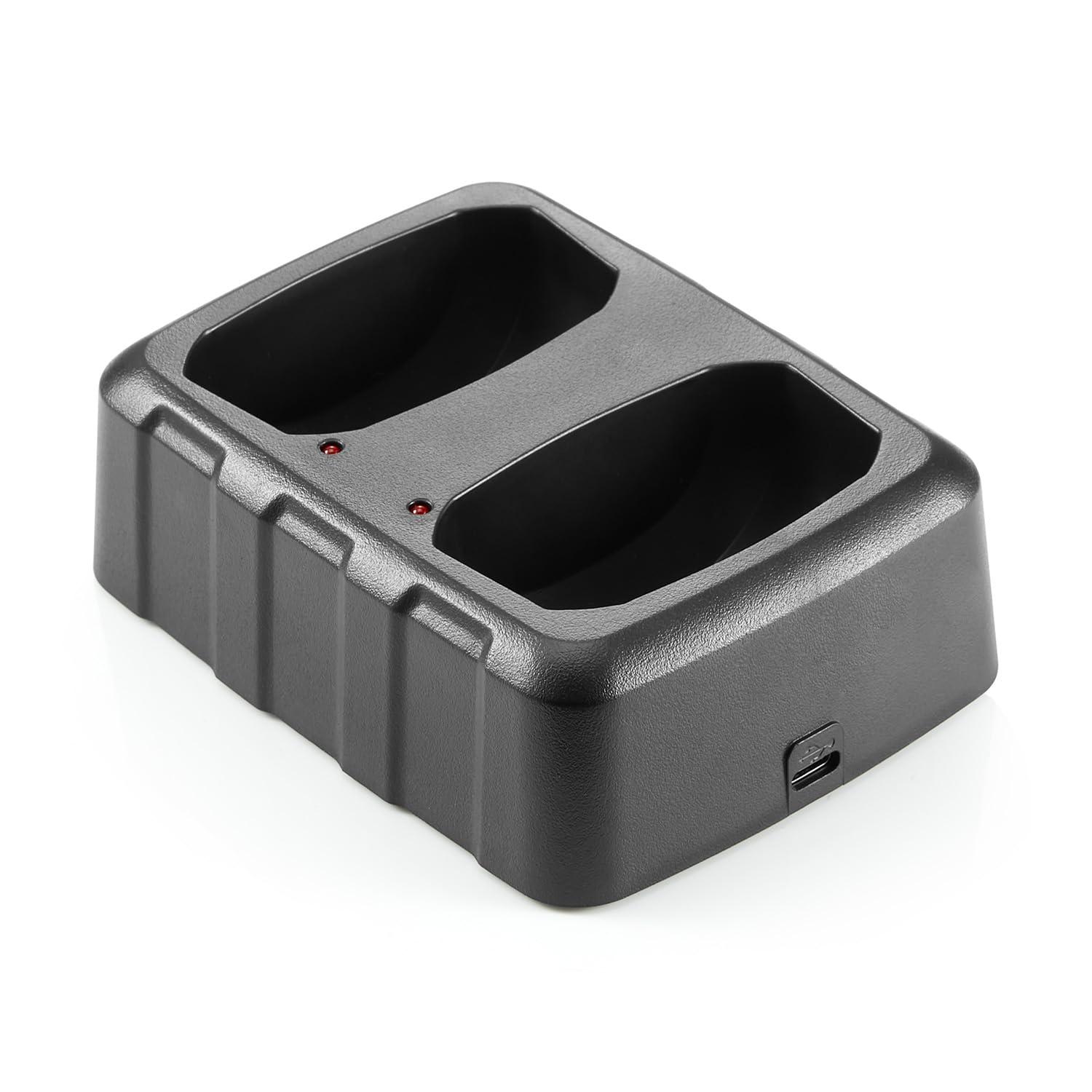 In the Box: 2x DXFRS800 Walkie Talkie Two Way Radios, 2x Li-Polymer Batteries, 2x Holsters, 1x Dual Port Micro-USB Charger with 2 Dock Adapters, 1x AC Adapter, User Guide