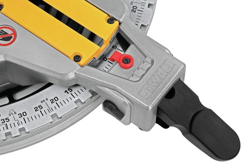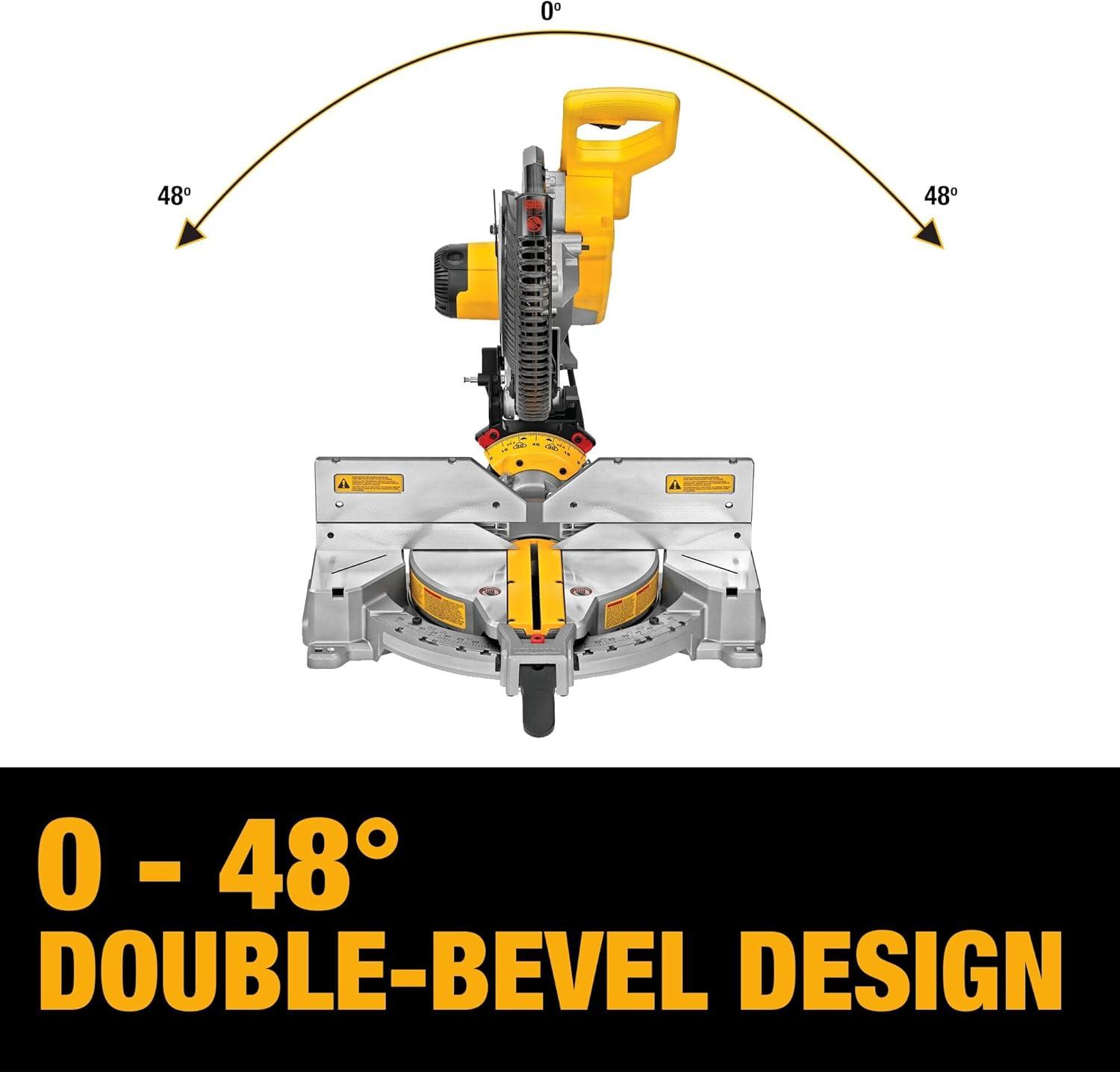 Double-bevel design of DEWALT miter saw allows saw to bevel 0 degree – 48 degree to the left and right with positive stops at 0 degree, 22.5 degree, 33.9 degree, and 45 degree