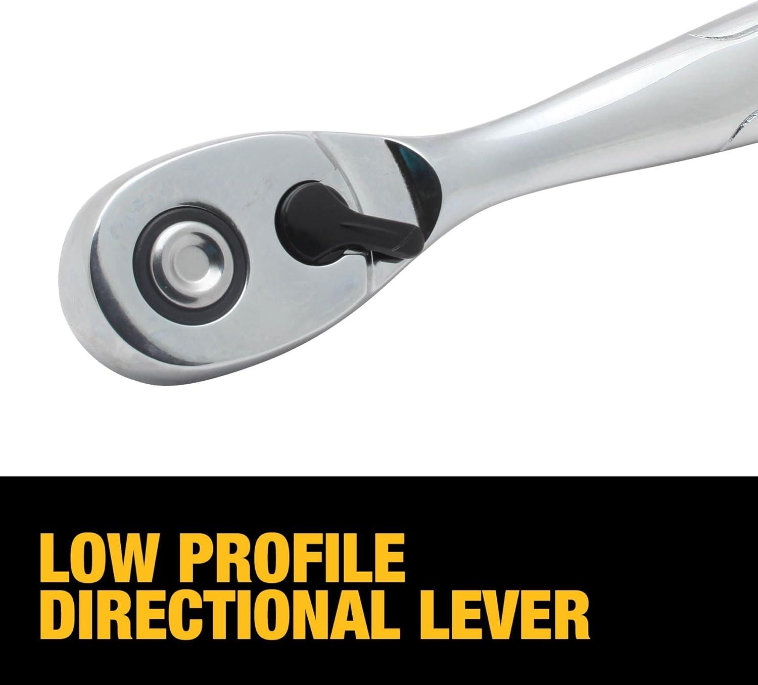 Socket set metric and standard has 72 tooth count ratchet providing a 5 degree arc swing for maneuverability in restricted areas