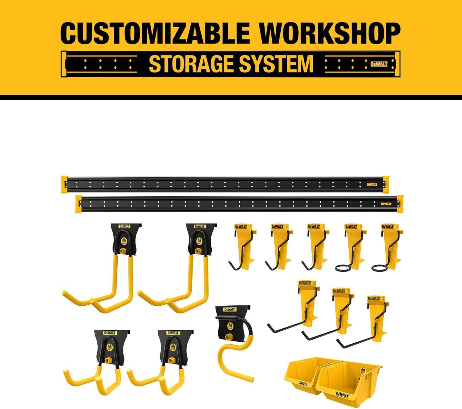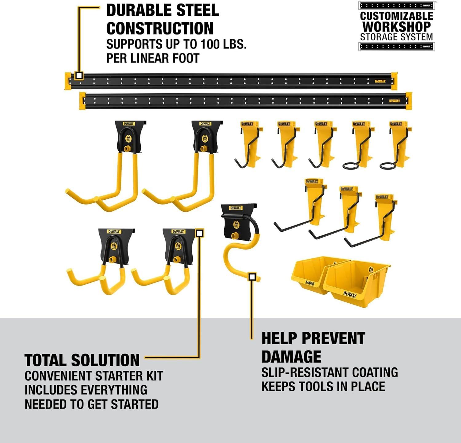 DEWALT Tool Organizer, 21 Piece Accessory Starter Kit, Includes 2 Metal Rails, 13 Hooks, and 2 Plastic Bins, DEWALT Workshop Storage System Compatible (DWST82801)(21 Piece Starter Kit)