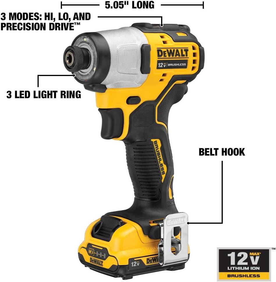 The XTREME 12V MAX* brushless 3/8 inch drill & impact driver kit contains two compact and performance packed tools. The DCD701 3/8 inch drill driver is ideal for a variety of drilling applications, especially precision drilling like pilot holes. The DCD701 is only 5.97 inch front to back with 250 UWO of power. DCF801 Brushless 1/4 inch Impact Driver is ideal for many fastening applications and comes with Precision DriveTM technology. It is only 5.05 inch front to back and comes packed to perform with 1,450 in-lbs of torque.